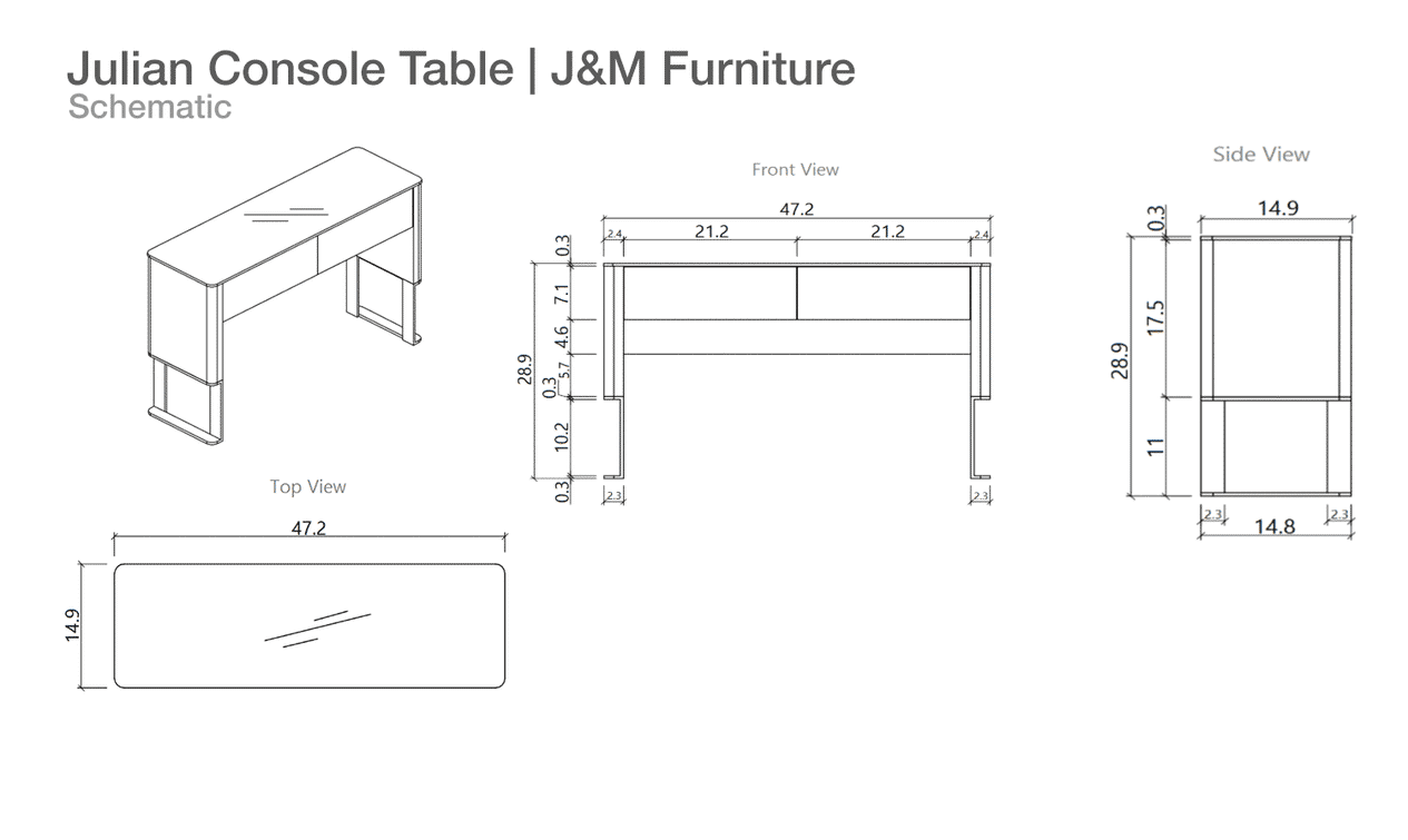 The Julian Console Table combines a Black Glass top, Walnut Wood veneer, and Chrome legs to achieve a bold and modern look. This console table features 2 deep drawers for convenient storage.