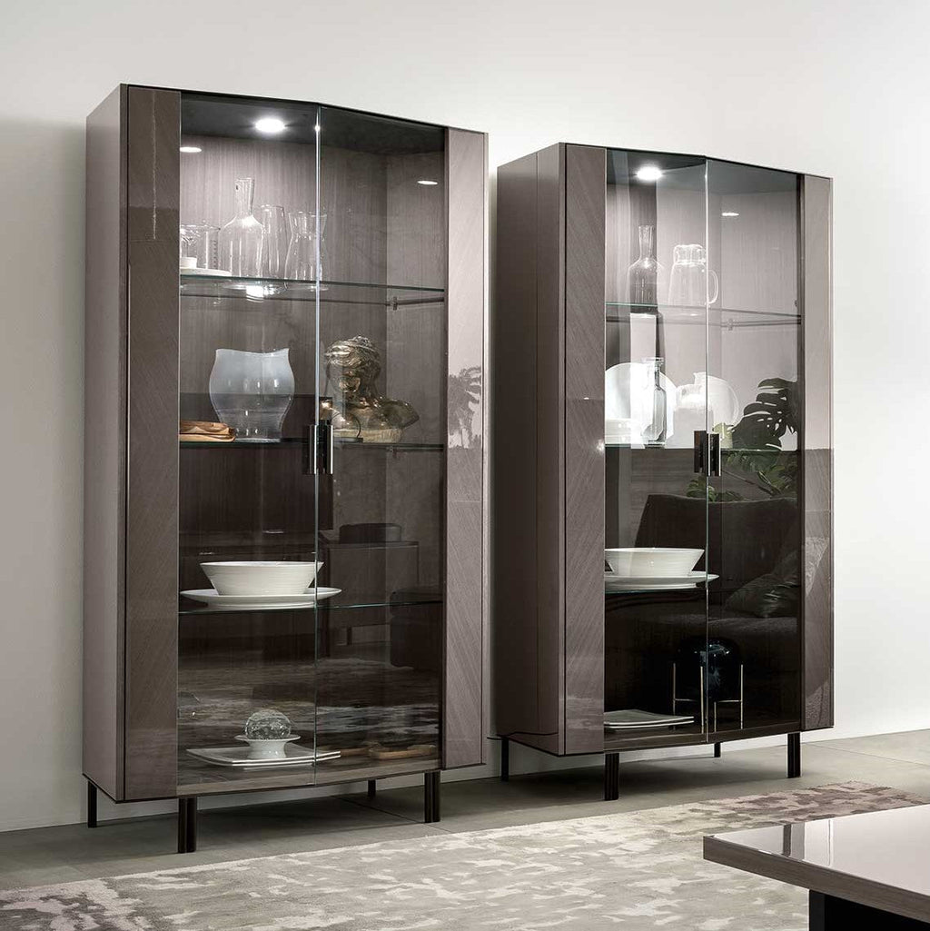 Enhance the allure of your glassware and collectibles with the Olimpia Curio Cabinet. Its large clear glass doors and built-in light beautifully showcase your cherished items, making them even more significant. Finished in eucalyptus velvet high gloss with sleek black metal handles & legs, this curio cabinet exudes elegance and modernity. Italia Furniture's longstanding partnership with ALF Italia ensures unrivaled product knowledge, dedicated support, and the best pricing for your utmost satisfaction.