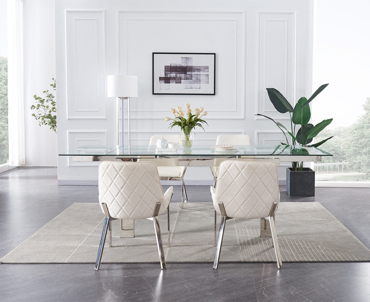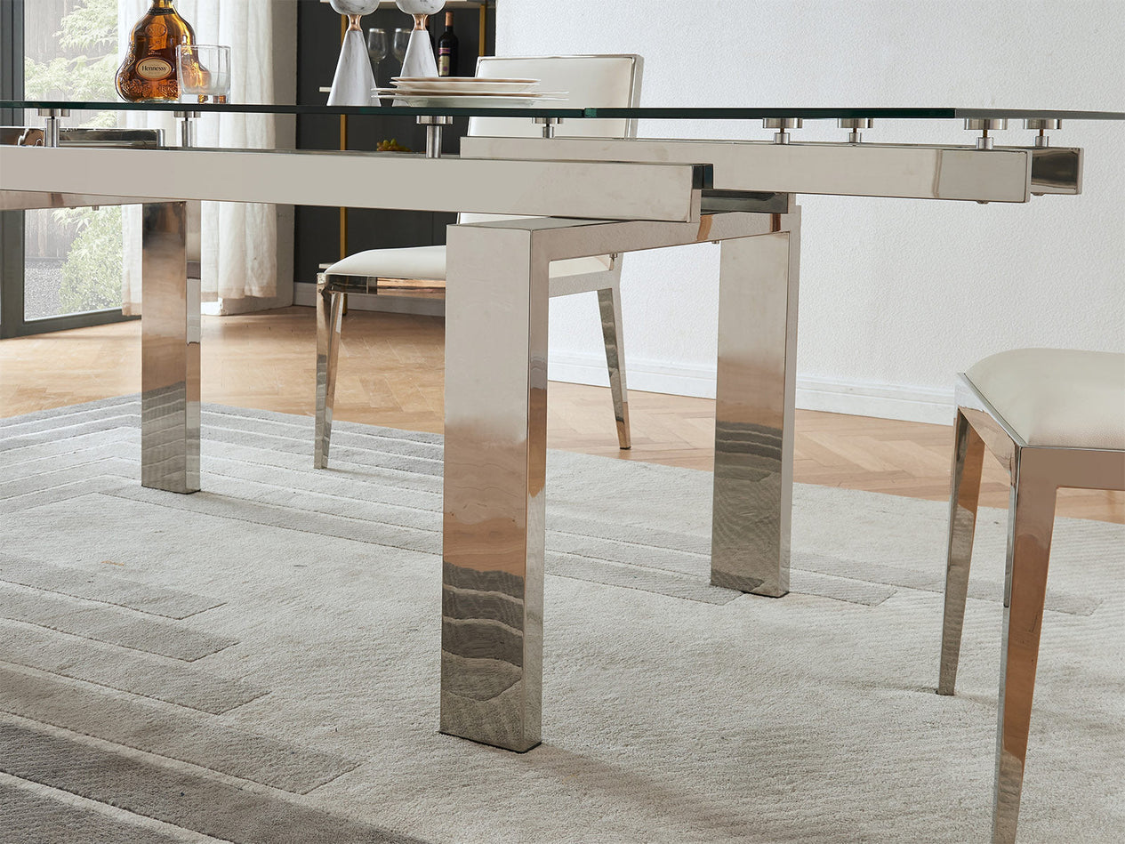 The Moda Extension Dining Table by J&M Furniture redefines pragmatism in the home. The Moda Table features two pull-out extensions from either side, allowing the table to transform into the entertainment focal point of the home. The polished steel legs complement the table's support mechanism, which can be seen through the clear glass top. The combination of steel and glass creates a harmony of design, easily compatible with many home decors.