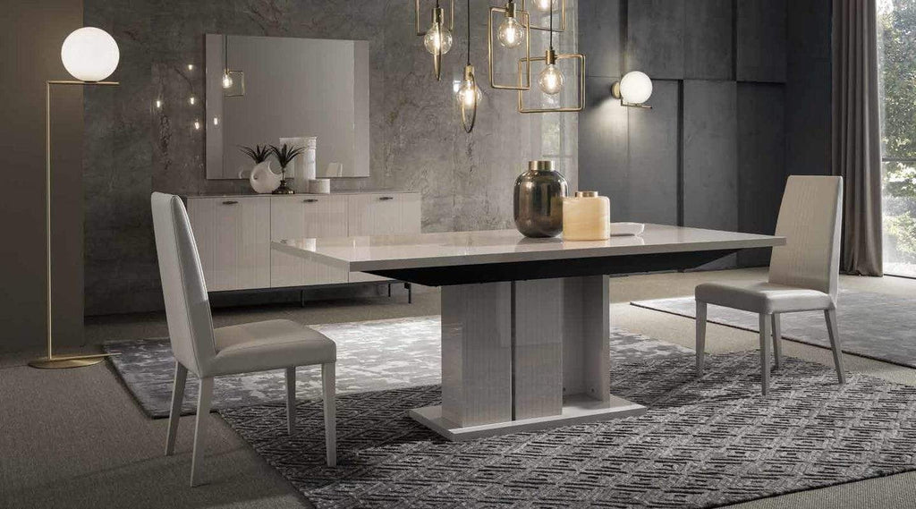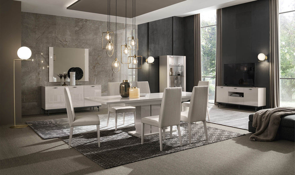 The Claire Dining Room Set is an elegant collection that emphasizes bold design with modern aspects. The Pearl Line Eco Veneer High Gloss finish, is renowned for its sophisticated vertical etching, adding a touch of elegance to any space.