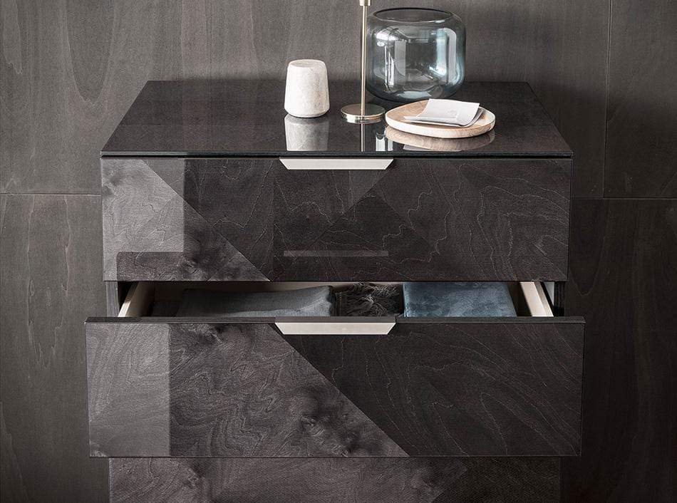 The gorgeous glossy finish together with the irresistible modern design of the new Riviera Bedroom collection will decorate any interior, making your sleeping area charming and comfortable. Dark Velvet Birch high gloss lacquer not only looks great but also is easy to keep clean. Geometric accents are realized in all the furniture pieces of the Riviera Bedroom Collection, complementing the design. Additional pieces for the bedroom set include; nightstands, dresser, chest, and mirror.