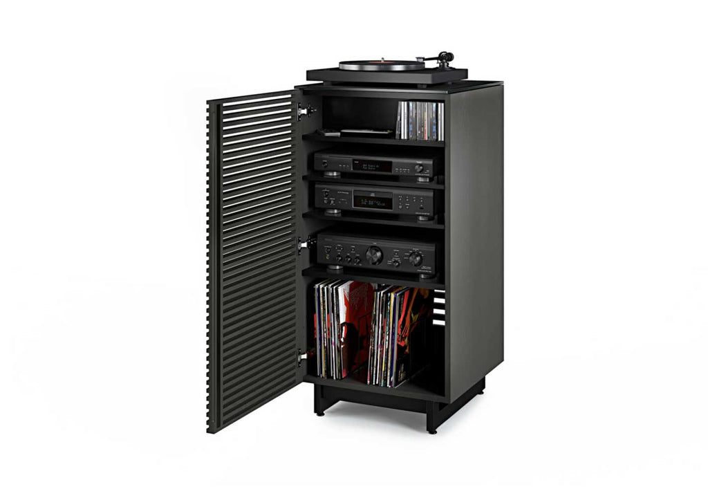 Beautifully designed customizable storage for audiophiles—this full-featured audio cabinet will keep your AV components, media, and favorite vinyl organized and accessible.