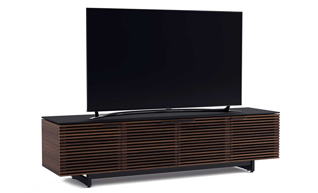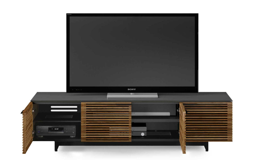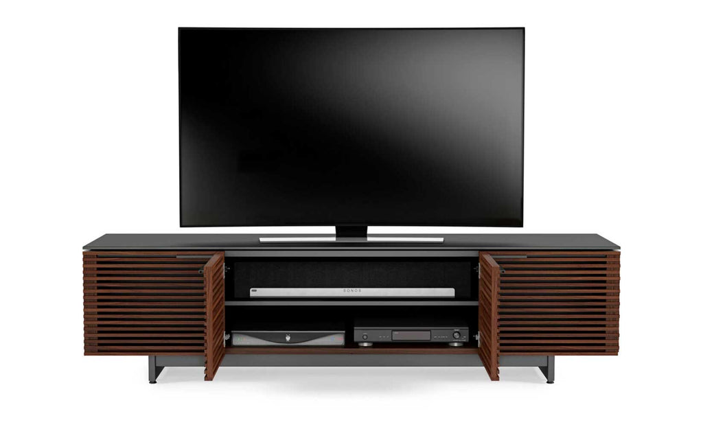 Designed with the home theater in mind—yet beautifully crafted furniture in its own right—the award-winning Corridor collection is the star of any living space. Louvered hardwood doors conceal a host of user-friendly features, sharply contrasted with a satin-etched glass top and black steel base.