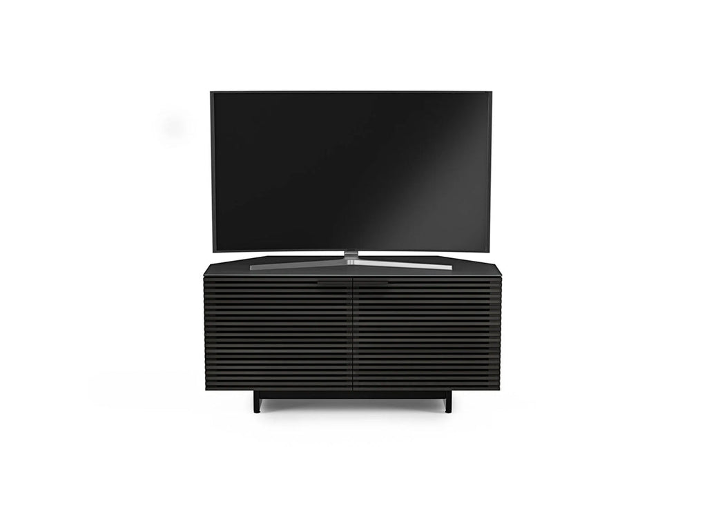 Whether against a wall or nestled in a corner, this modern TV stand makes full use of a limited footprint.