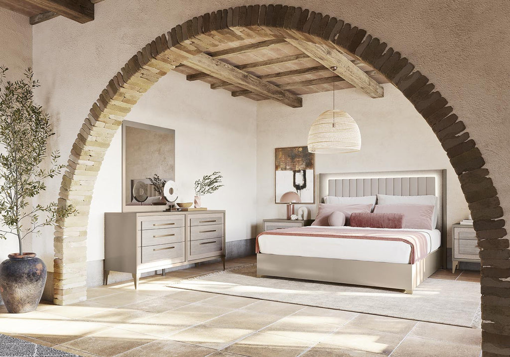 The dresser from Ellen's collection embodies the warm hues and gentle tones that define her design philosophy, bringing the inviting authenticity of a Tuscan farmhouse into your bedroom. Architectural inspirations are evident in the dresser's subtle details, such as the rhythmic patterns on the padded headboard and the nuanced depths of its drawers.