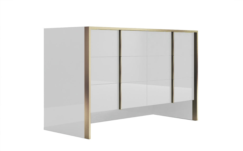 The Fiocco Bedroom is our newest Italian set that redefines luxury. The “Gold Leaf” trim in front of the case goods is replicated on the vertical handles of the drawers and it is scaled to deliver a tasteful design that is rich but not overwhelming. Gold finishes are an everlasting trend in luxury furniture so the glossy white lacquer color. The flooding design of the bed suspended with a metal central bar is matched by the one on the case goods. The upholstered headboard is covered in eco-leather, a material that stands well when in touch with human hair.