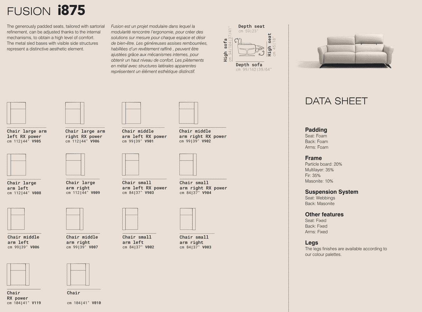 Fusion is a modular project in which modularity meets ergonomics, to create tailor-made solutions for every space and desire for well-being. The generously padded seats, tailored with sartorial refinement, can be adjusted thanks to the internal mechanisms, to obtain a high level of comfort. The metal sled bases with visible side structures represent a distinctive aesthetic element.