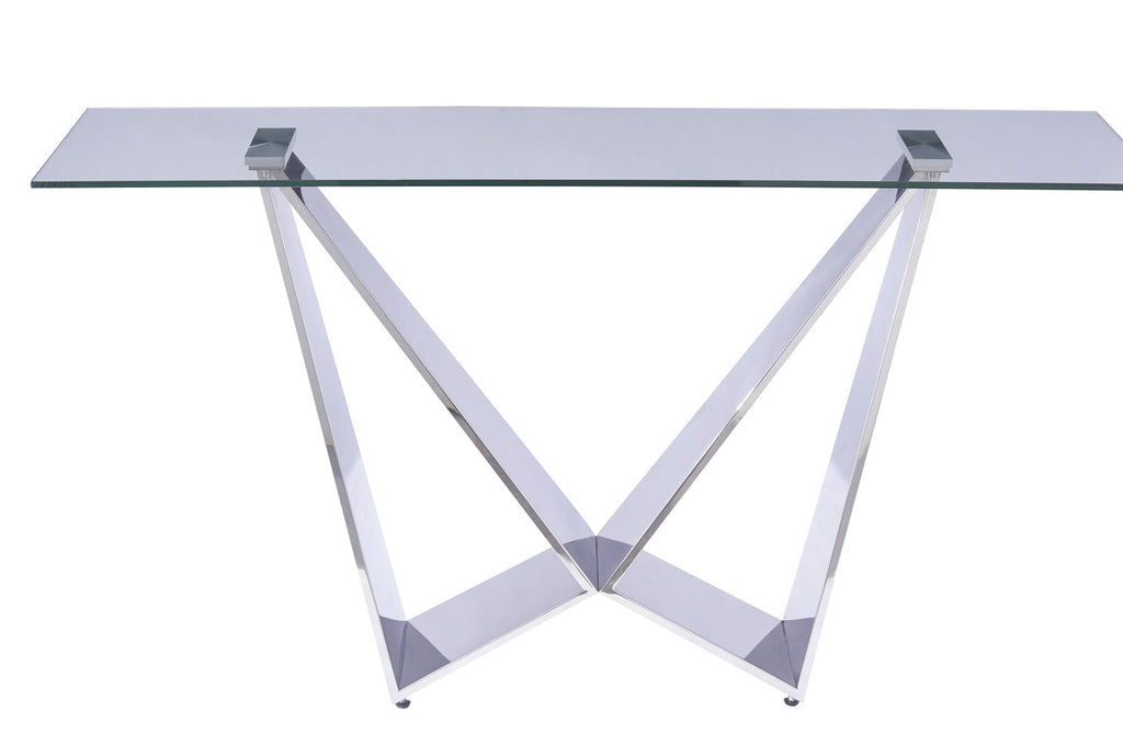 Complementing the glass top is a sleek chrome base, creating a bold and modern look that exudes contemporary style. The combination of glass and chrome achieves a seamless blend of sophistication and modernity, making the Harmony console a true statement piece.