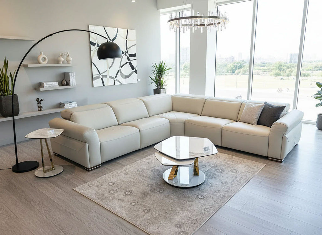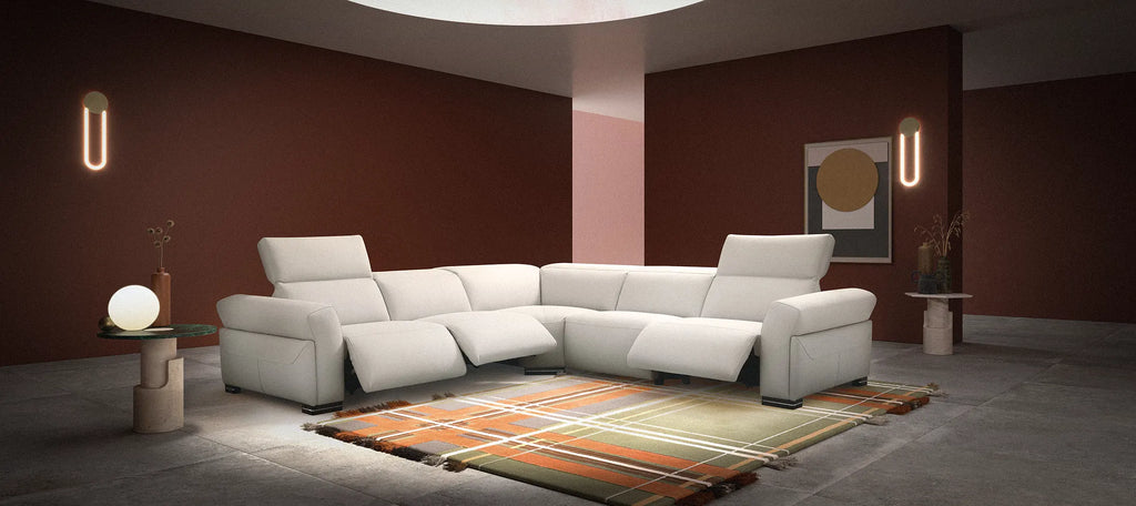 This sectional features a softer interpretation of modern style with an emphasis on comfort. Three (3) power recliners with independently-controlled heads and footrests. Top-grain leather makes the sectional a beautiful anchor piece in a contemporary living room while not sacrificing comfort and functionality.