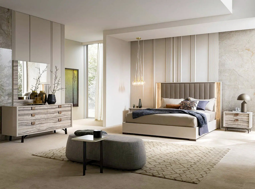 The combination of two one finishes defines the style of this collection. Pearl Eco Veneer and natural wood finish simply look stunning. The Dresser features a soft-closing mechanism.