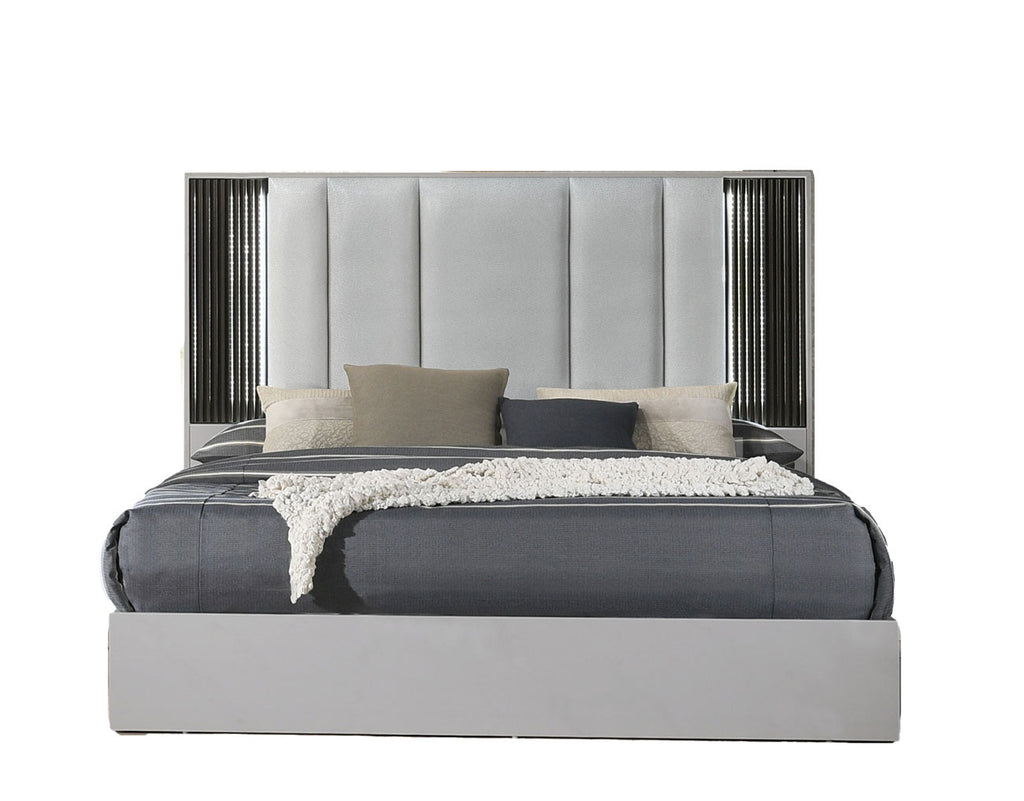 Introducing the Lucia Bedroom by J&M Furniture, a perfect fusion of modern design and luxurious comfort. The Lucia bed showcases a striking grey design, creating a modern look. Black ribbed accents add depth and contrast, enhancing the overall aesthetic and making a bold statement in your bedroom.