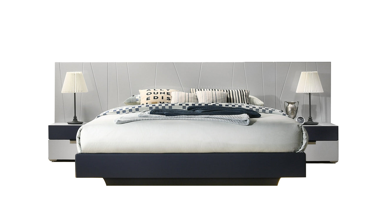 The Marsala premium bedroom features an elegant design beautifully mixing a light grey lacquer finish and navy. The headboard has LED lights The interplay of light grey with navy continues in the night stands, chest, and dresser.  As with all of J&M's premium collection bedrooms the case goods come equipped with soft closing tracks by Blum, a world-renowned German manufacturer that sets the standards for the finest quality furniture hardware.