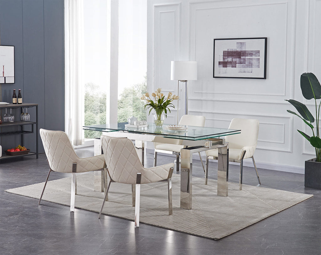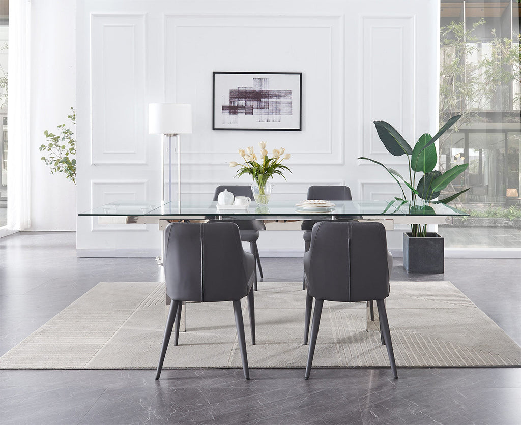 The Moda Extension Dining Table by J&M Furniture redefines pragmatism in the home. The Moda Table features two pull-out extensions from either side, allowing the table to transform into the entertainment focal point of the home. The polished steel legs complement the table's support mechanism, which can be seen through the clear glass top. The combination of steel and glass creates a harmony of design, easily compatible with many home decors.