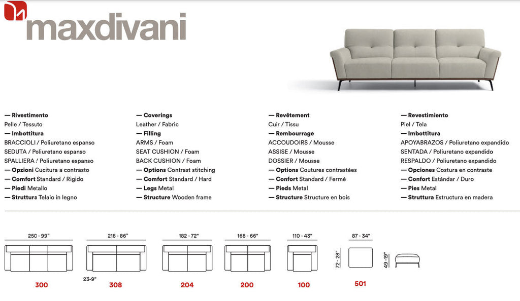 The pride of the MaxDivani Contemporary collection, Noa combines the vintage features of the ‘70s, thanks to its slightly shaped armrest, topstitching on the backrests, and a traditional wooden shell, with modern details given by the peculiar black nickel-colored foot, its comfort and the correct dimensions of sofas that furnish contemporary homes. The wooden elements feature a Canaletto walnut finish and the sofa is available with leather or fabric upholstery.