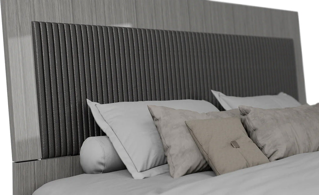 The Novecento bedroom group is made in Italy and covered in high gloss Silver wood with a black eco-leather headboard. The wood is accented by matte black metal. The bedroom consists of a king or queen bed, matching dresser, mirror, chest, and vanity.