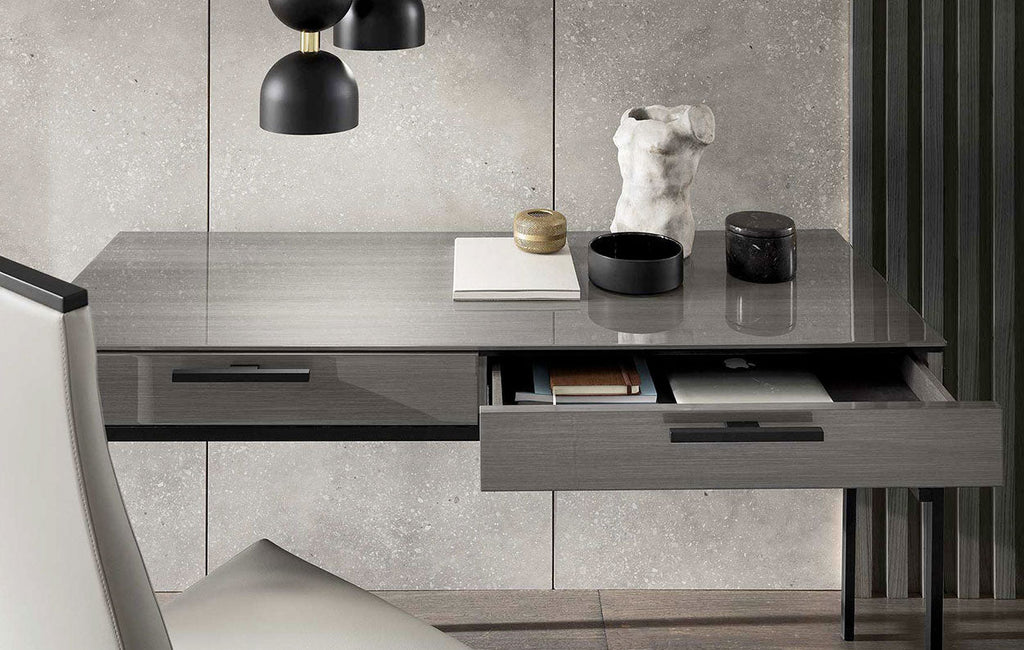 The desk is beautifully finished with black metal legs and handles, adding a touch of sophistication to its overall design. Its versatility extends beyond the office, as it can be easily transformed into a bedroom dressing table when paired with a mirror. Embrace the flexibility and elegance of the ALF Italia Novecento 2 Drawer Desk, a versatile piece that enhances both your productivity and style.