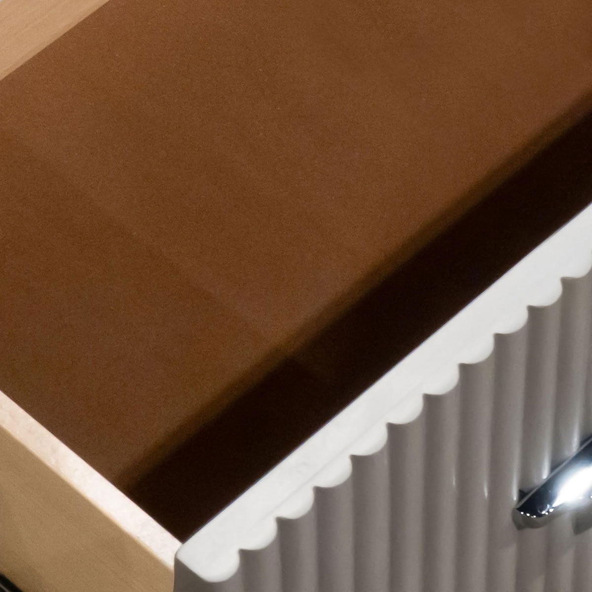 The Onyx Nightstand by J&M Furniture showcases modern sophistication and luxurious detailing. Its light beige ribbed texture adds elegance, while the black stone top provides a striking contrast to enhance the contemporary design. Perfectly sized for convenience, the Onyx Nightstand is an ideal companion to the Onyx Bedroom Set, combining style and functionality seamlessly.