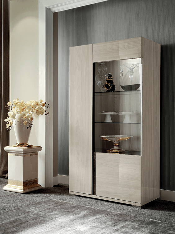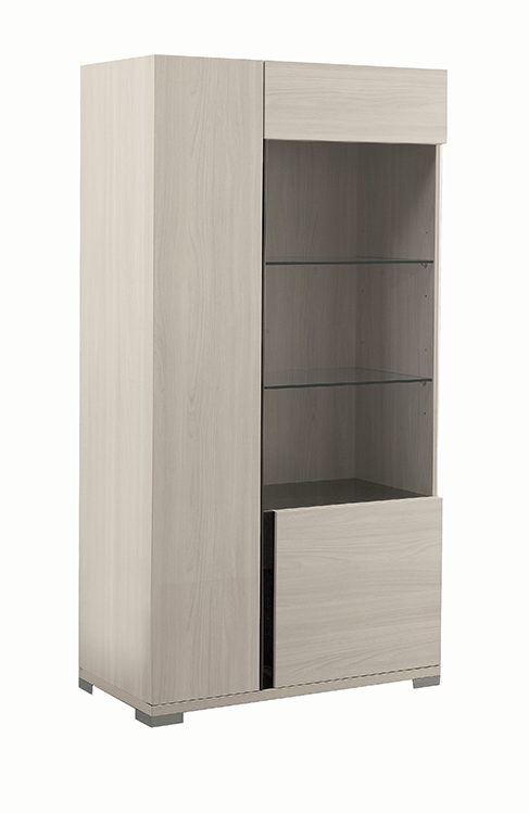 The Teodora Curio Cabinet, part of the Teodora collection by Alf Italia, exudes a modern and sophisticated aura with its sleek contrasting glass and wooden doors. Crafted with light elm eco veneer, this cabinet offers generous storage space, featuring one glass door to bring light and intrigue to the contents, and one light elm stone veneer door to enhance its stylish appeal. Elevate your interior with this stunning and functional piece from the Teodora collection.