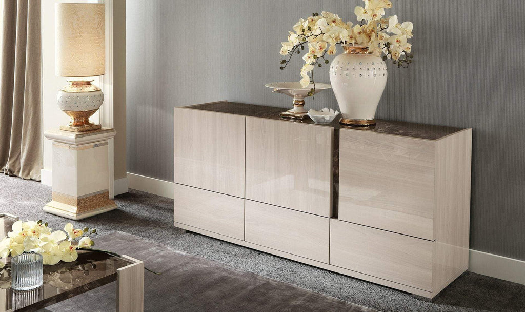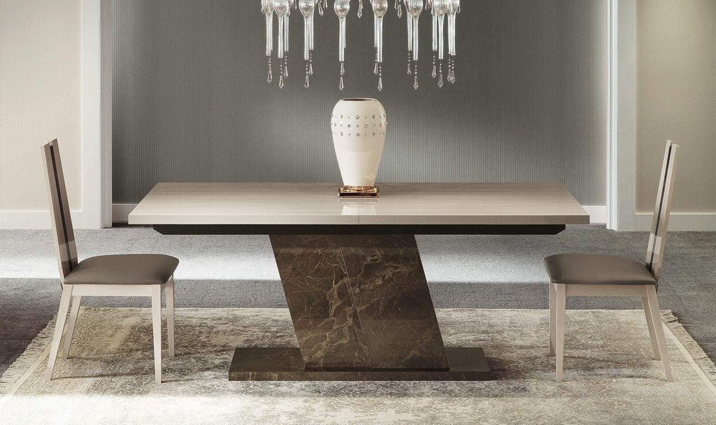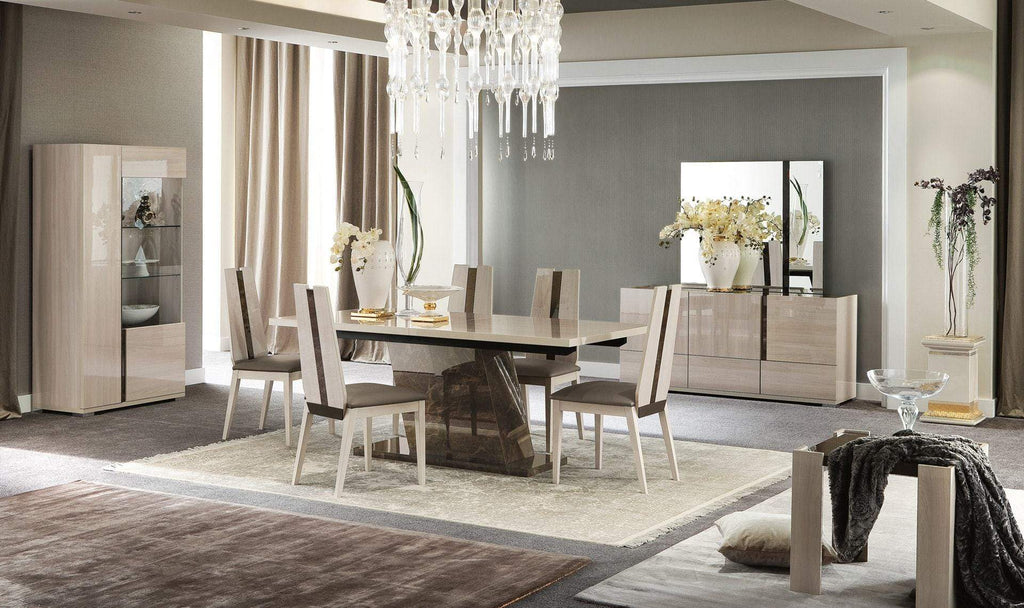 The Teodora dining room set combines Light Elm with Emperador stone to produce a sincere and welcoming atmosphere to your dining experience. The table is available in two sizes and comes with one extension leaf that can be stored easily in the base. The buffet and curio add additional space for storage and to display some of your kitchenware.
