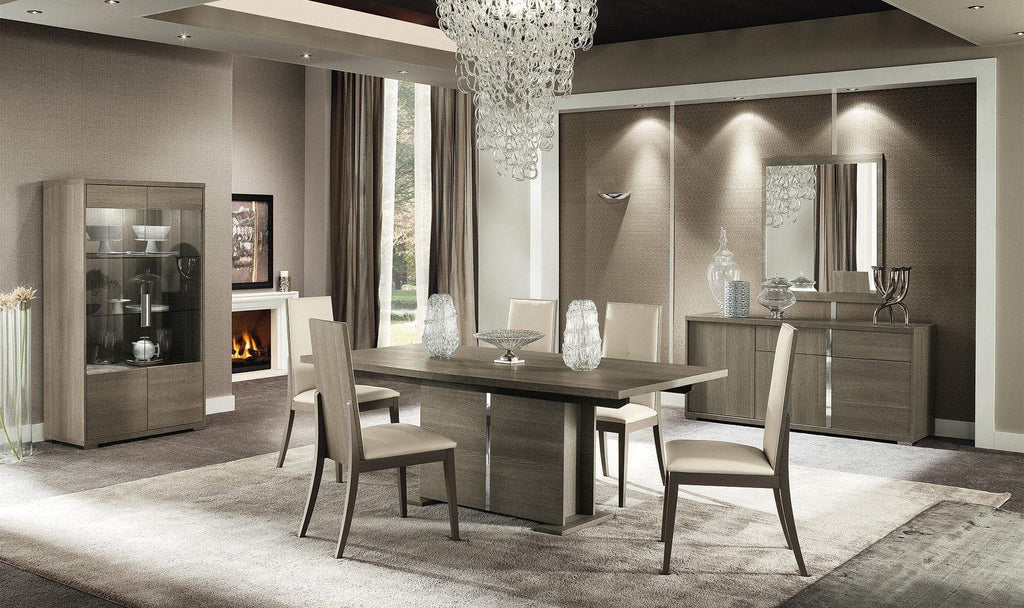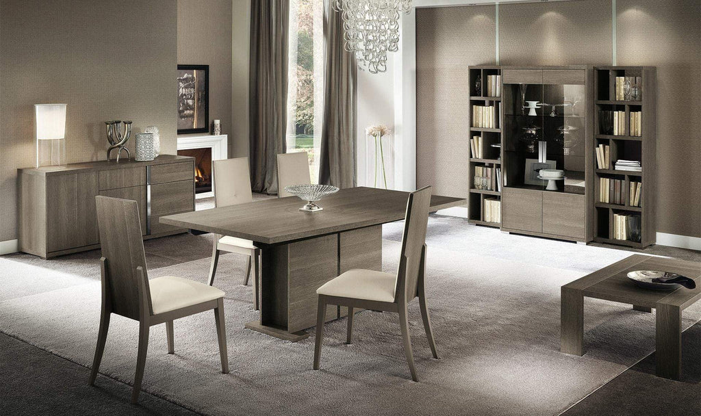 Tivoli Dining Room Set designed and manufactured in Italy. This dining room set is made of premium quality wood veneer materials, eco-leather, and chrome accents. This collection offers everything needed to make your dinette area stylish and functional. The rectangular Dining Table is available in two sizes, both with extension that is kept inside. Gorgeous matching chairs are upholstered in soft and durable eco-leather that is super easy to keep clean.