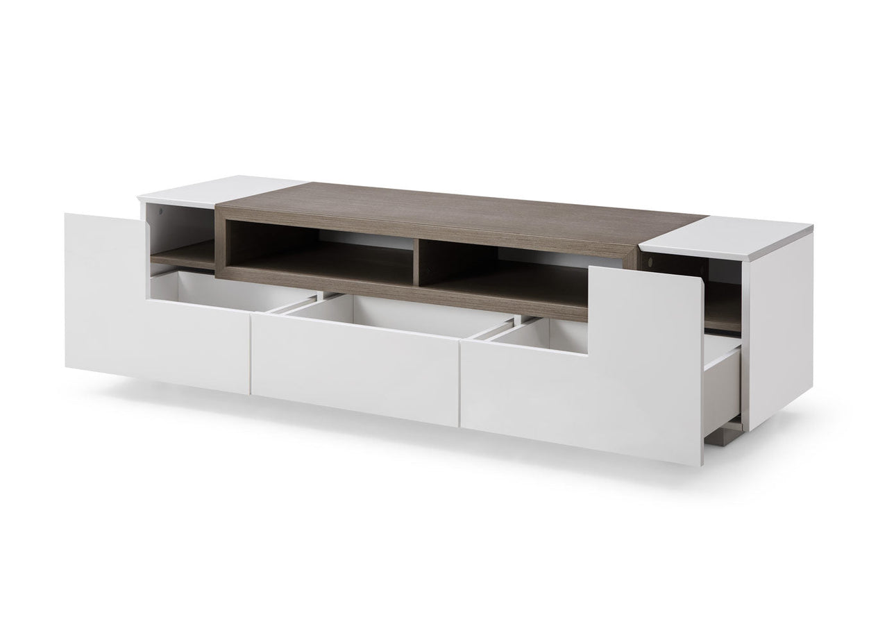 The TV002 TV Stand features a contemporary design with a beautiful combination of White High-Gloss with Grey veneer. Perfect for any room in your home. Soft closing tracks on the drawers, plenty of storage space for your media. Contemporary TV stand with a beautiful combination of light grey high gloss. Perfect for any kind of room setting.